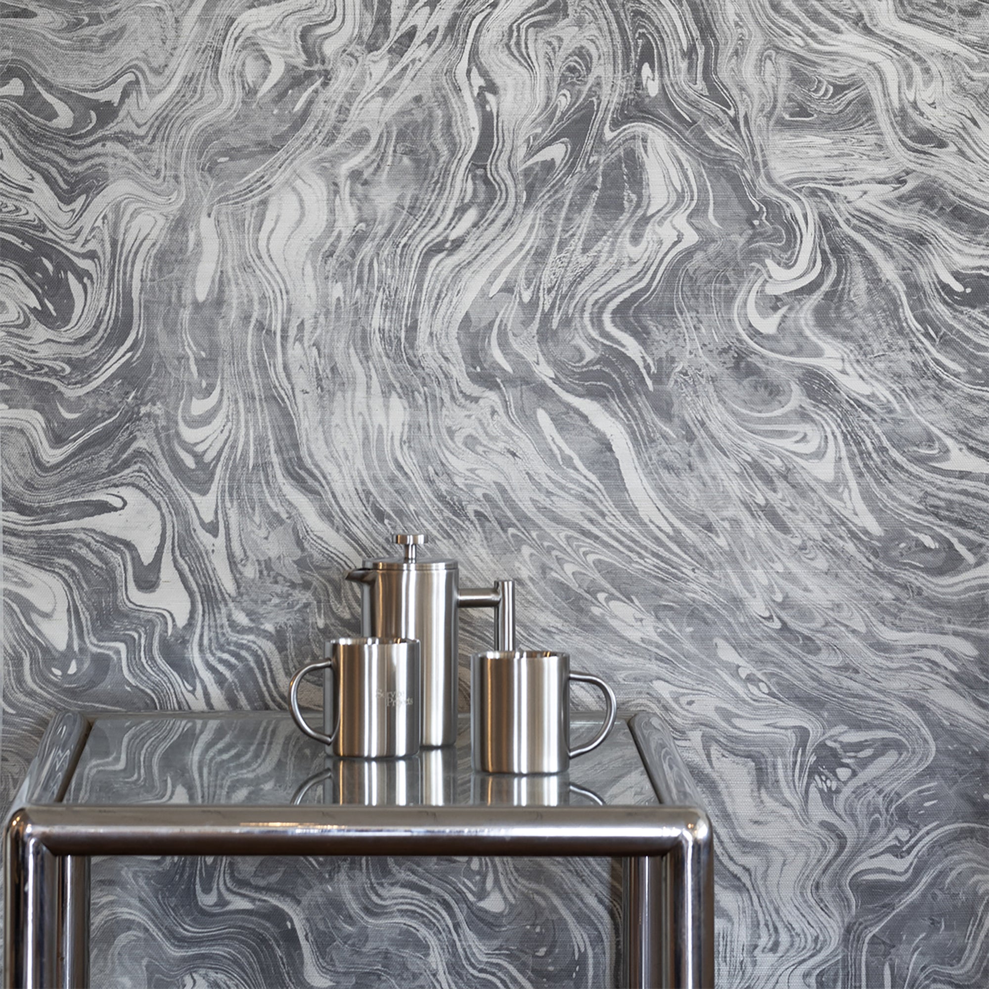 Terrain began with an original handmade marbled paper design further exaggerated into the sinuous pattern found in all instances of one force fighting its way through another: ink through water, rivers through terrain, and so on.