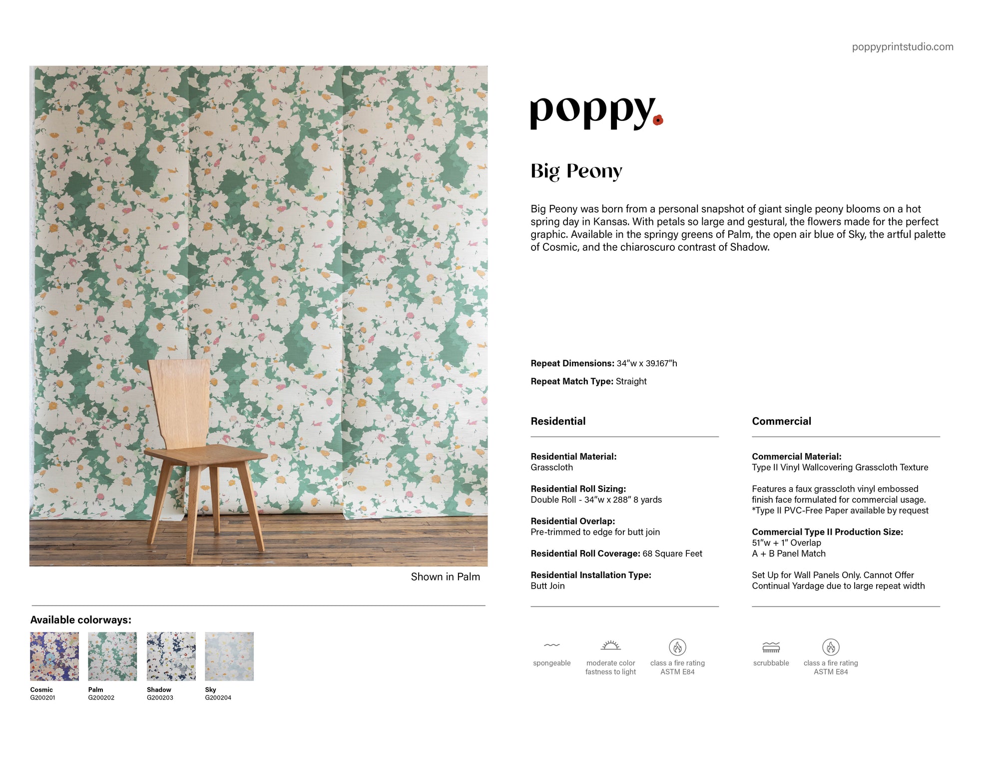 Big Peony was born from a personal snapshot of giant single peony blooms on a hot spring day in Kansas. With petals so large and gestural, the flowers made for the perfect graphic. Available in the springy greens of Palm, the open air blue of Sky, the artful palette of Cosmic, and the chiaroscuro contrast of Shadow.Â