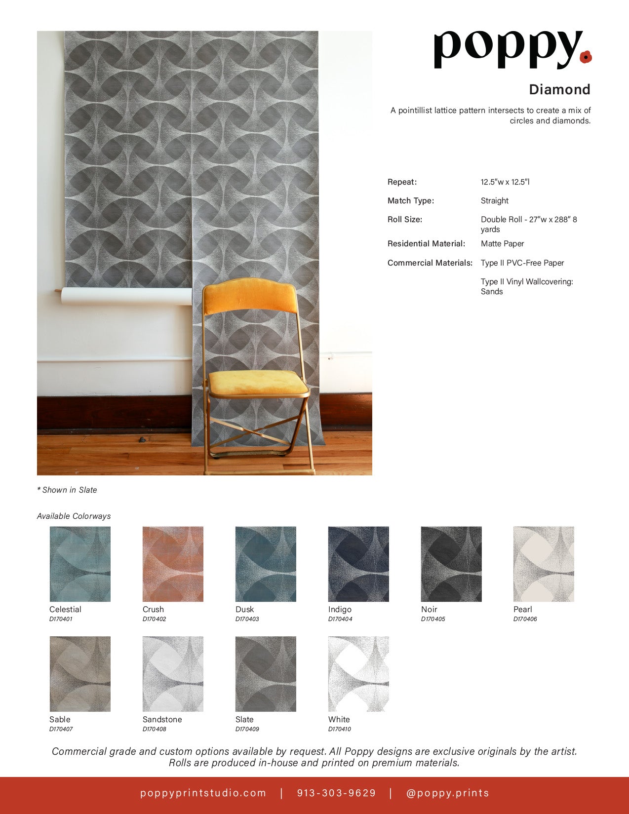 Commercial wallcoverings are produced to order and are non-returnable. Samples are non-refundable. For project cancellations, contact sales@poppyprintstudio.com as soon as possible, as orders not yet in production may be eligible for cancellation. Once production begins, the order is final. Excess material should be placed into attic stock for future repairs with the same dye-lot batch.
