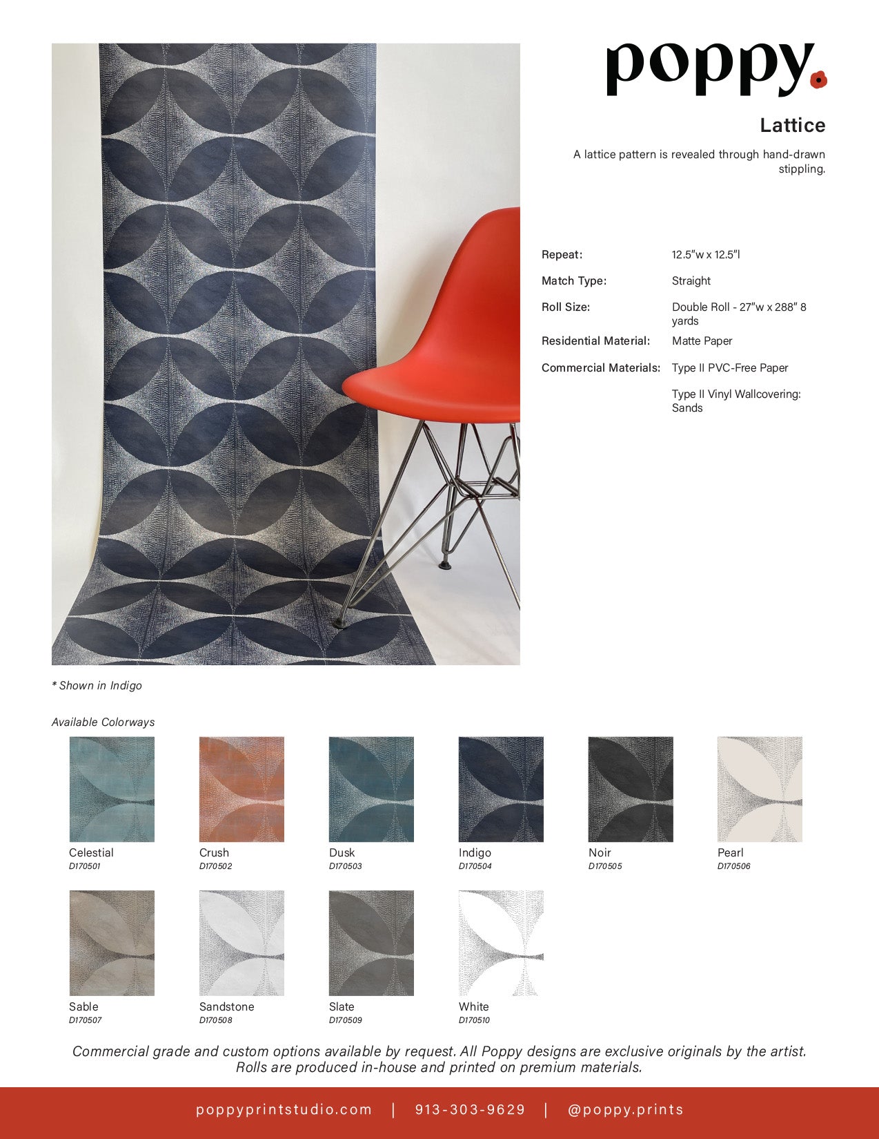 Because our residential wallpapers are printed to order, rolls cannot be returned or exchanged once produced. Samples are non-refundable. If you receive wallpaper with manufacturing defects — including print flaws, incorrect color, or shipping damage — contact us within 48 hours at sales@poppyprintstudio.com with photos and we will replace it at no charge. We strongly recommend ordering a sample first to confirm your color and pattern selection.