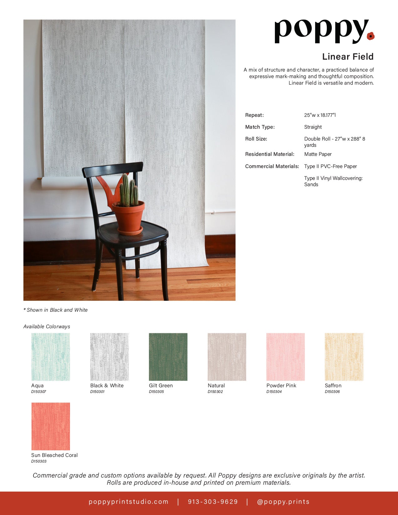 Yes. Custom colors, scale changes, and design modifications are available by request on most patterns. Because custom orders require a new print setup, minimums and lead times may differ from stock orders. Contact us at sales@poppyprintstudio.com with your project details and we will provide pricing and a timeline. Visit our full FAQ at /pages/wallpaper-faq for more details.