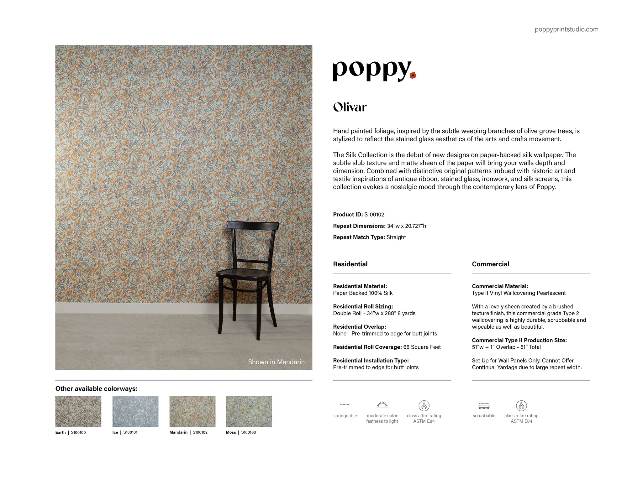 Poppy commercial wallcoverings are scrubable and meet at Type II durability designations. Ordinary dirt and smudges can be removed with a mild soap and warm water solution. Clean from the bottom of the wall, moving upward. Gently rinse with clean water from the top down using a clean sponge. Dry wallcovering with a soft lint free cloth or towel. Always test soap and water mixture in an inconspicuous area of the wallcovering first to be sure the surface is not damaged.