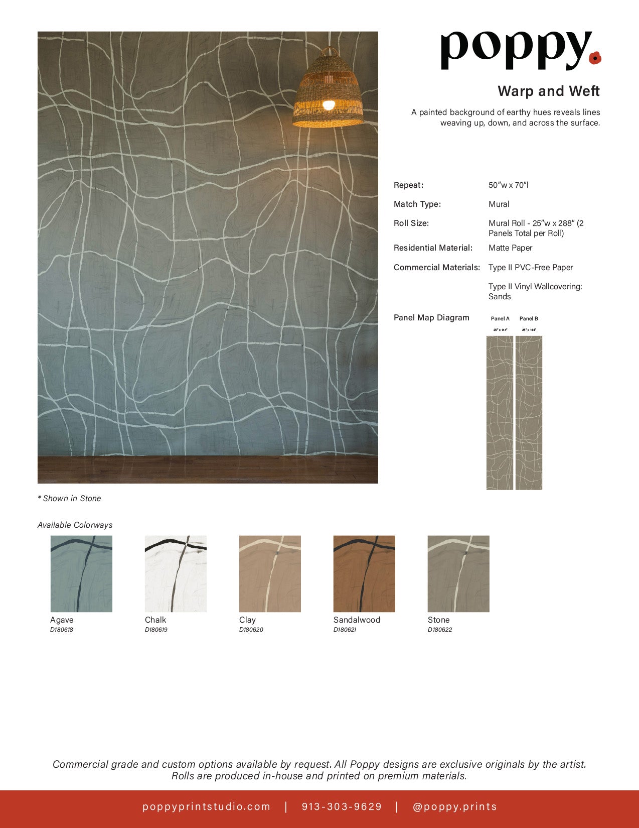 Poppy commercial wallcoverings are scrubable and meet at Type II durability designations. Ordinary dirt and smudges can be removed with a mild soap and warm water solution. Clean from the bottom of the wall, moving upward. Gently rinse with clean water from the top down using a clean sponge. Dry wallcovering with a soft lint free cloth or towel. Always test soap and water mixture in an inconspicuous area of the wallcovering first to be sure the surface is not damaged.