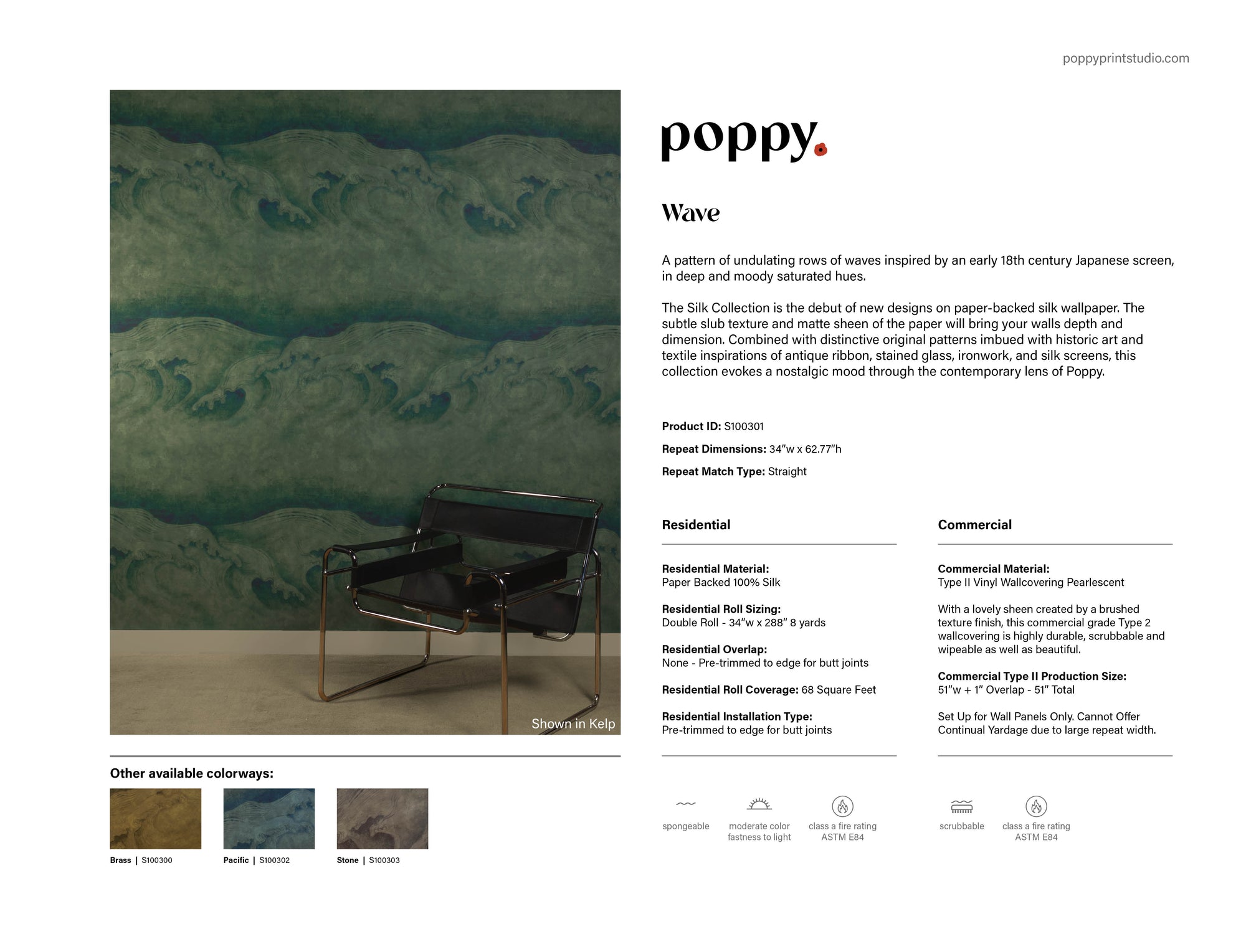 Wave is inspired by an antique Japanese screen. An originally foreboding scene, this interpretation isolates the moments of beauty that exist in nature's powerful magnitudes. With a mural-like repeating pattern of undulating rows, Wave is available in the rich colors of our natural world.